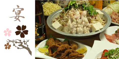 〇前菜2種 〇白又は赤もつ鍋 〇揚げもの 〇炒めもの 〇シメの麺 |